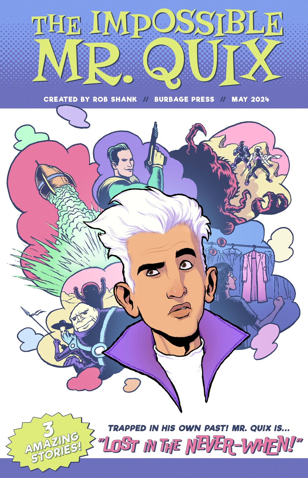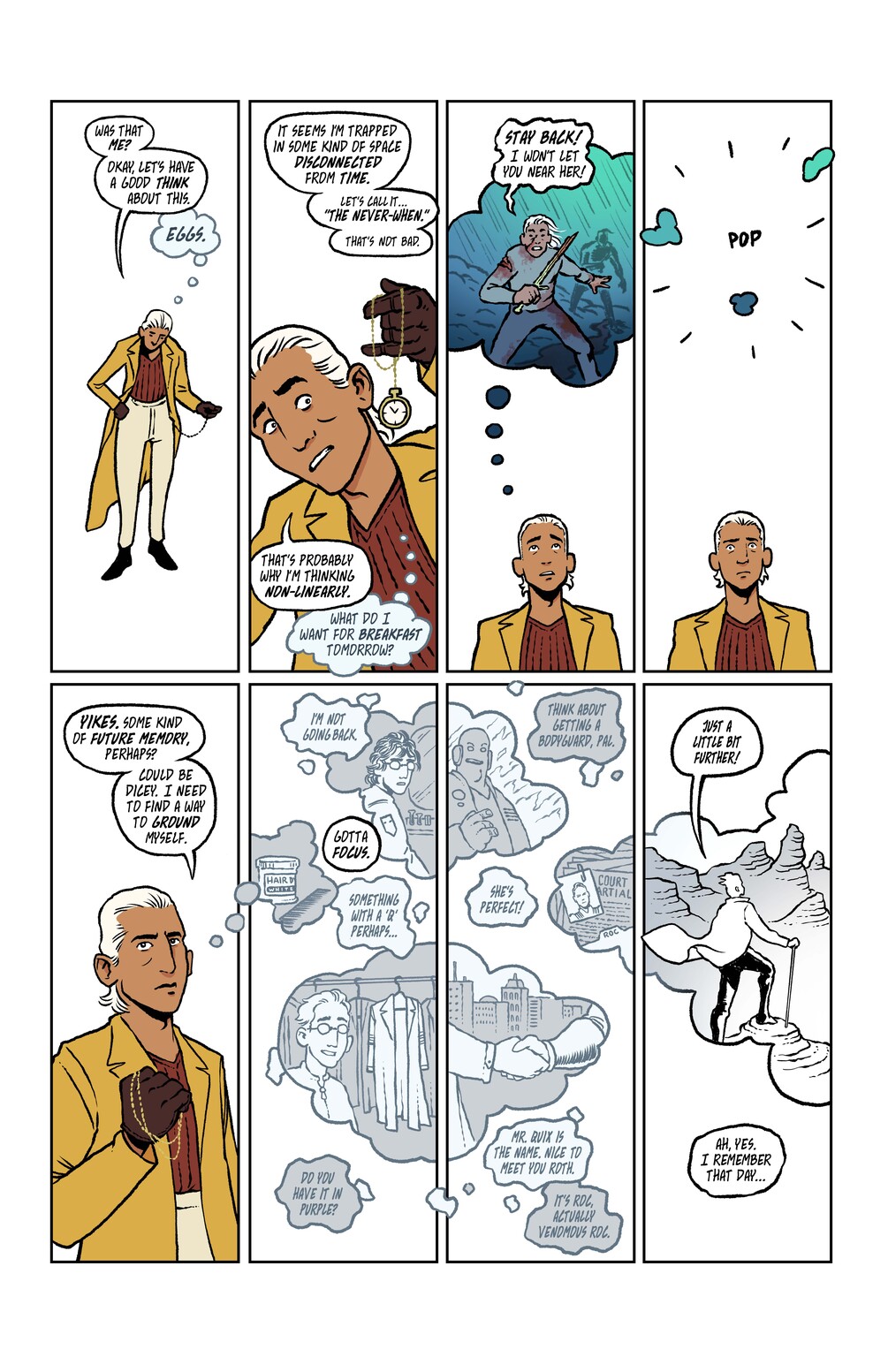 Mr. Quix is trapped in The Never-When, a mysterious universe where time and space defy logic. To escape, he'll have to search his own past in two riveting tales! First, a sight-seeing hike through The Cliffs of Largos becomes a race against death! Then, Mr. Quix and Roc confront the formidable robber baron Baltus Pennymason and travel between worlds in Flight of the Zephyr!
